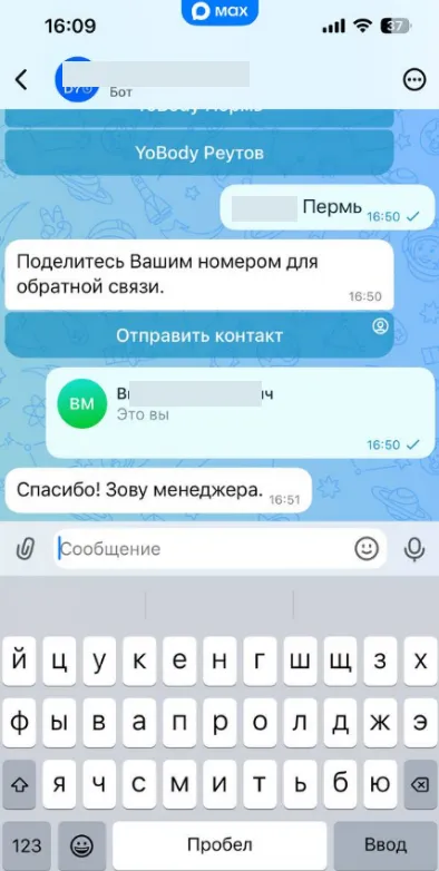 Мы выстроили систему так, что клиенты сами переходят в Telegram-бот или MAX-бот (в зависимости от того, какой канал сейчас доступен).