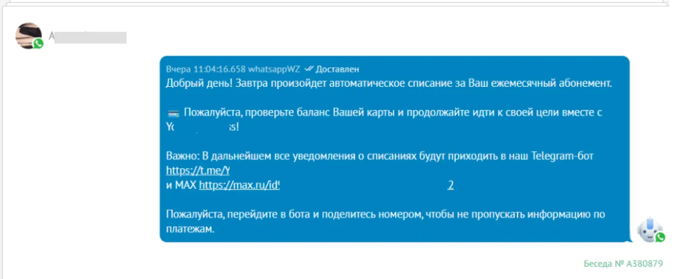 Например, в данном случае клиенту ежемесячно приходит уведомление о предстоящем списании, он хочет получать и дальше их, поэтому охотно переходит в ботов.