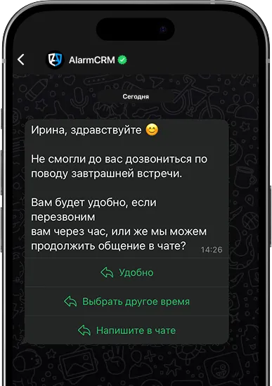 Проблема: Менеджер звонит — клиент не берёт трубку. Менеджер спустя пару часов забывает перезвонить, клиент теряется. Решение: CRM+интеграция с телефонией фиксирует непринятый звонок, и через WhatsApp или email автоматически уходит сообщение:
