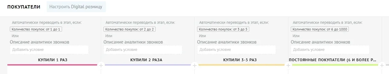 После анализа бизнес-процессов компании было принято решение настраивать несколько воронок продаж и использовать функционал «Покупатели». Также были настроены дополнительные поля для карточек сделок и контактов.